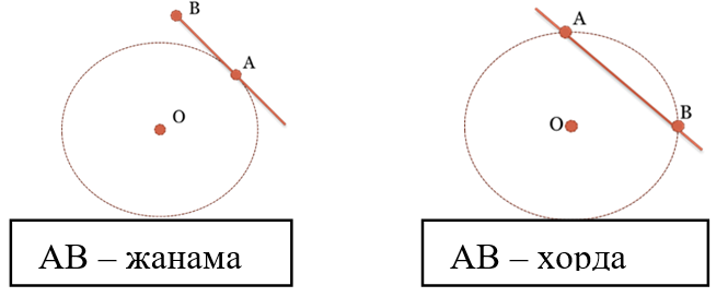 Түзу – шеңберді бір немесе екі нүктеде қия алады. Бір нүктеде қиса онда ол кесінді (түзу) жанама деп аталады. Екі нүктеде қиса, онда шеңбердің ішінде қалған кесінді хорда деп аталады